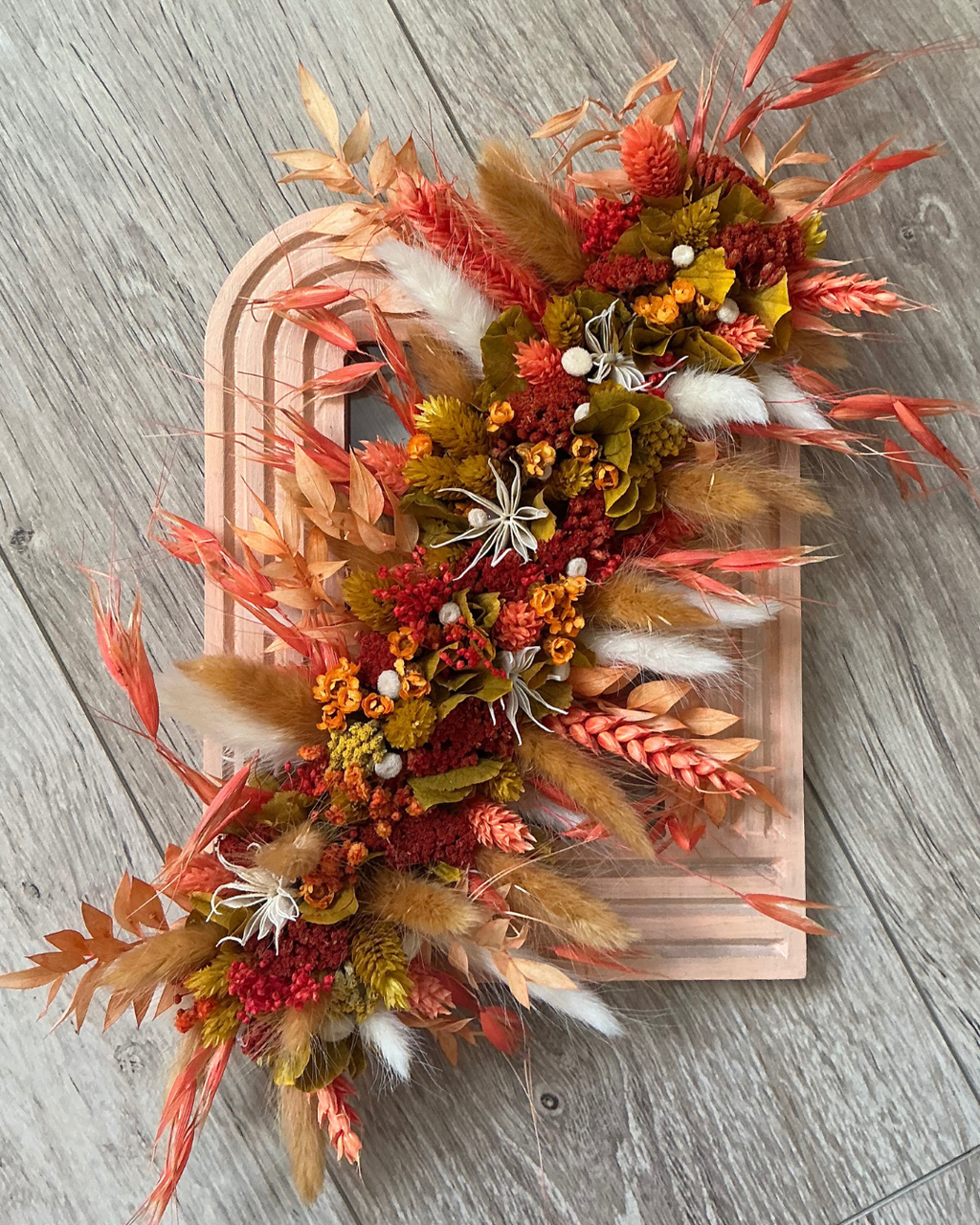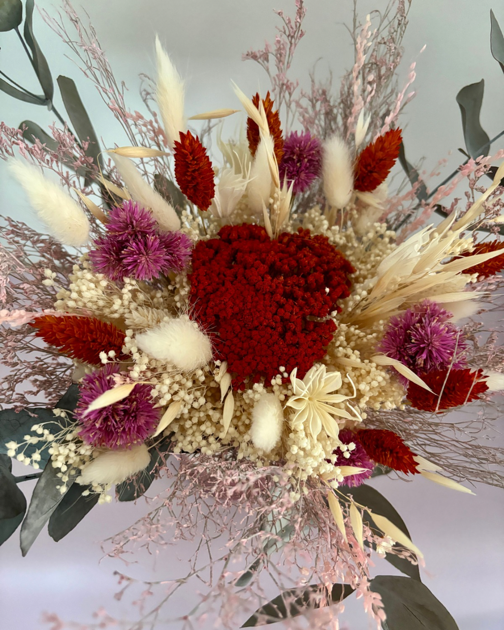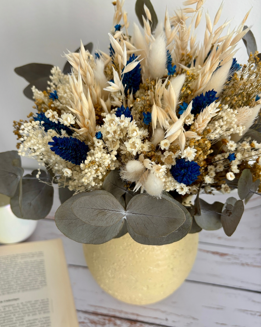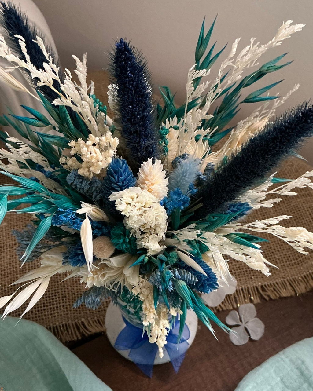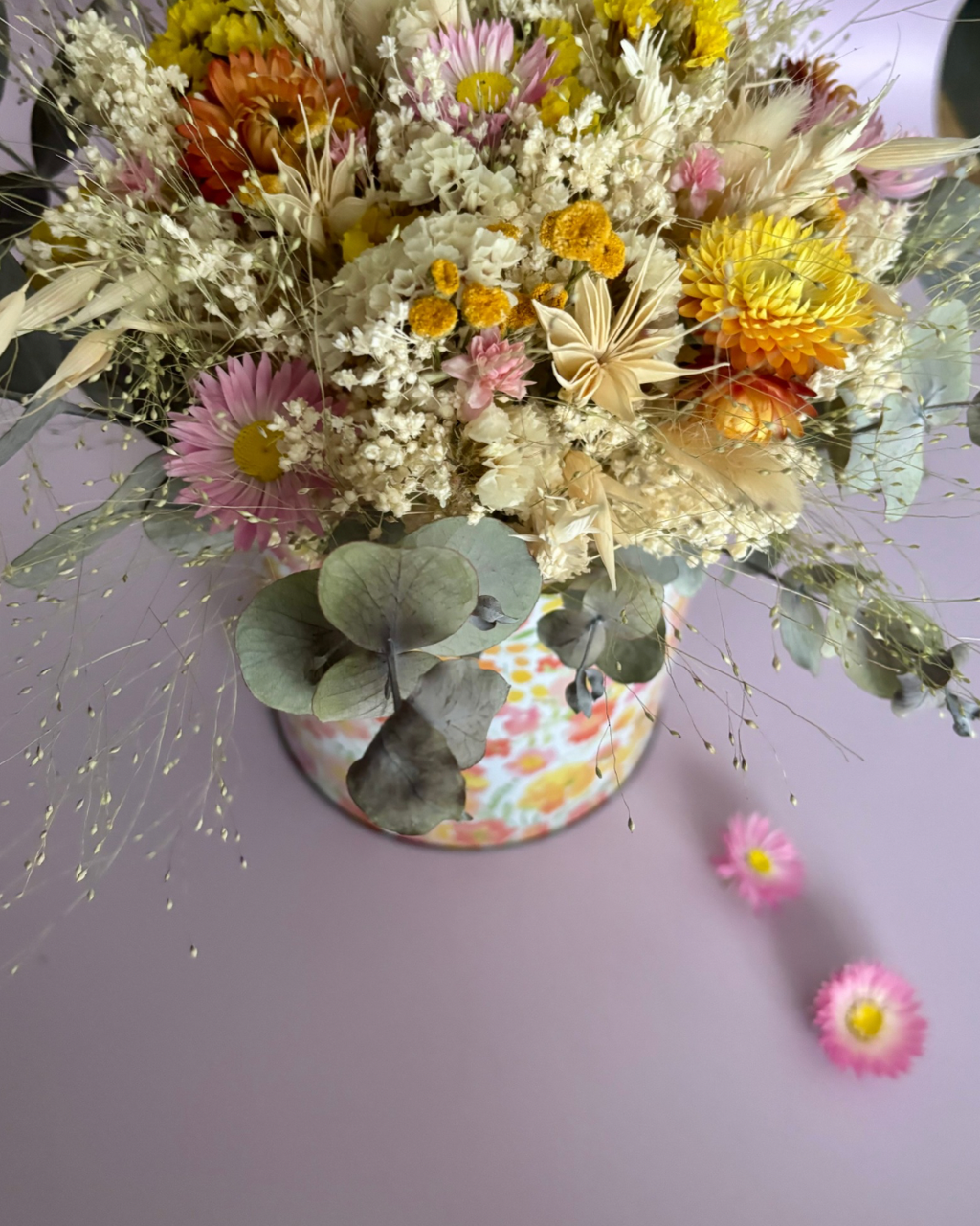 Les fleurs séchées sont un choix durable et facile à vivre : elles demandent très peu d’entretien. Il suffit de les installer à l’abri du soleil direct et de l’humidité pour conserver leur éclat d’origine.