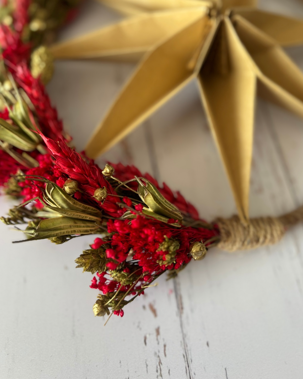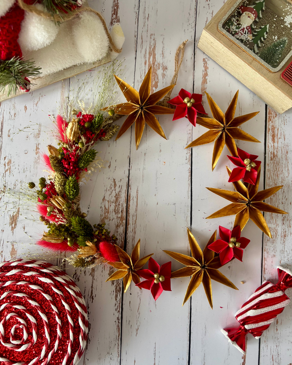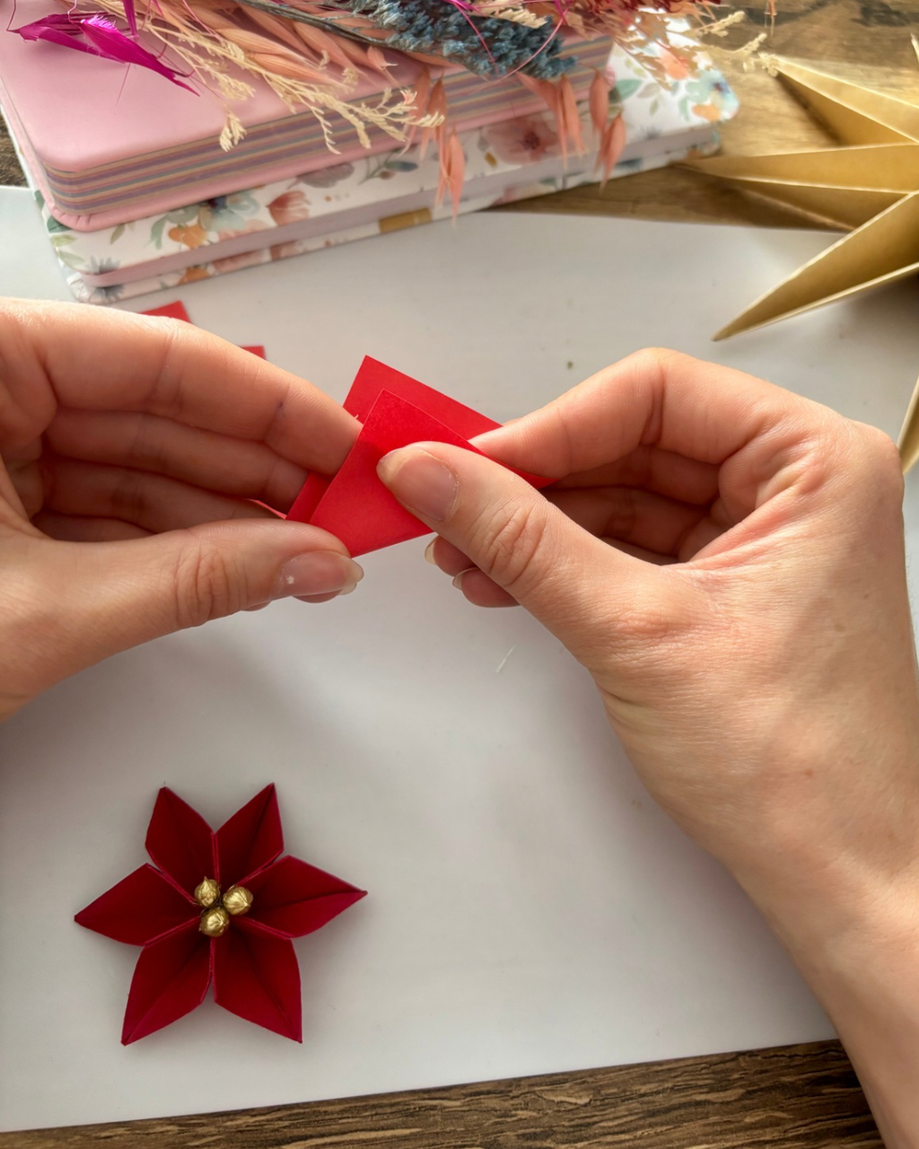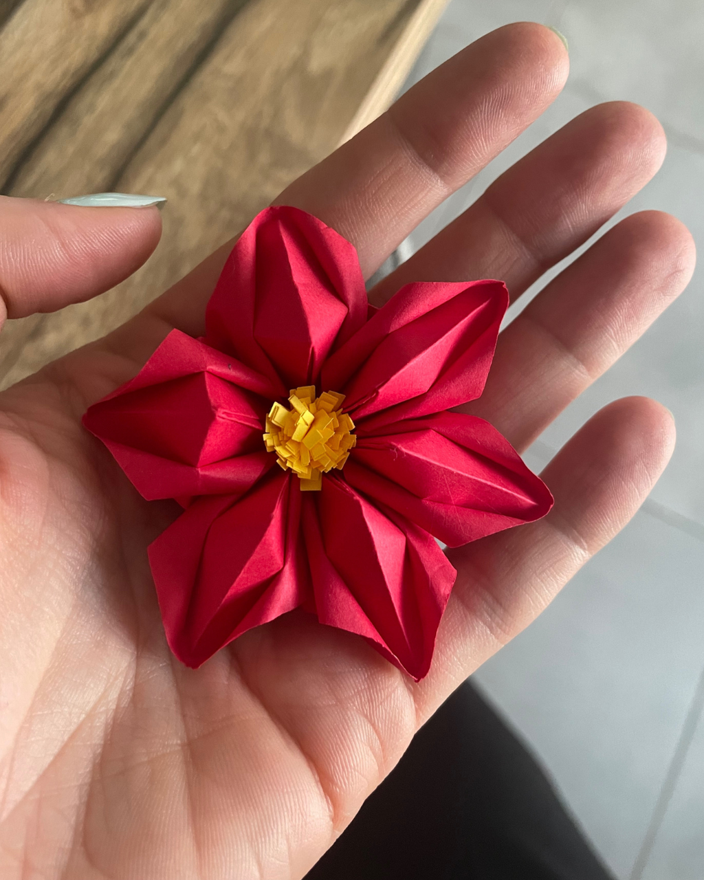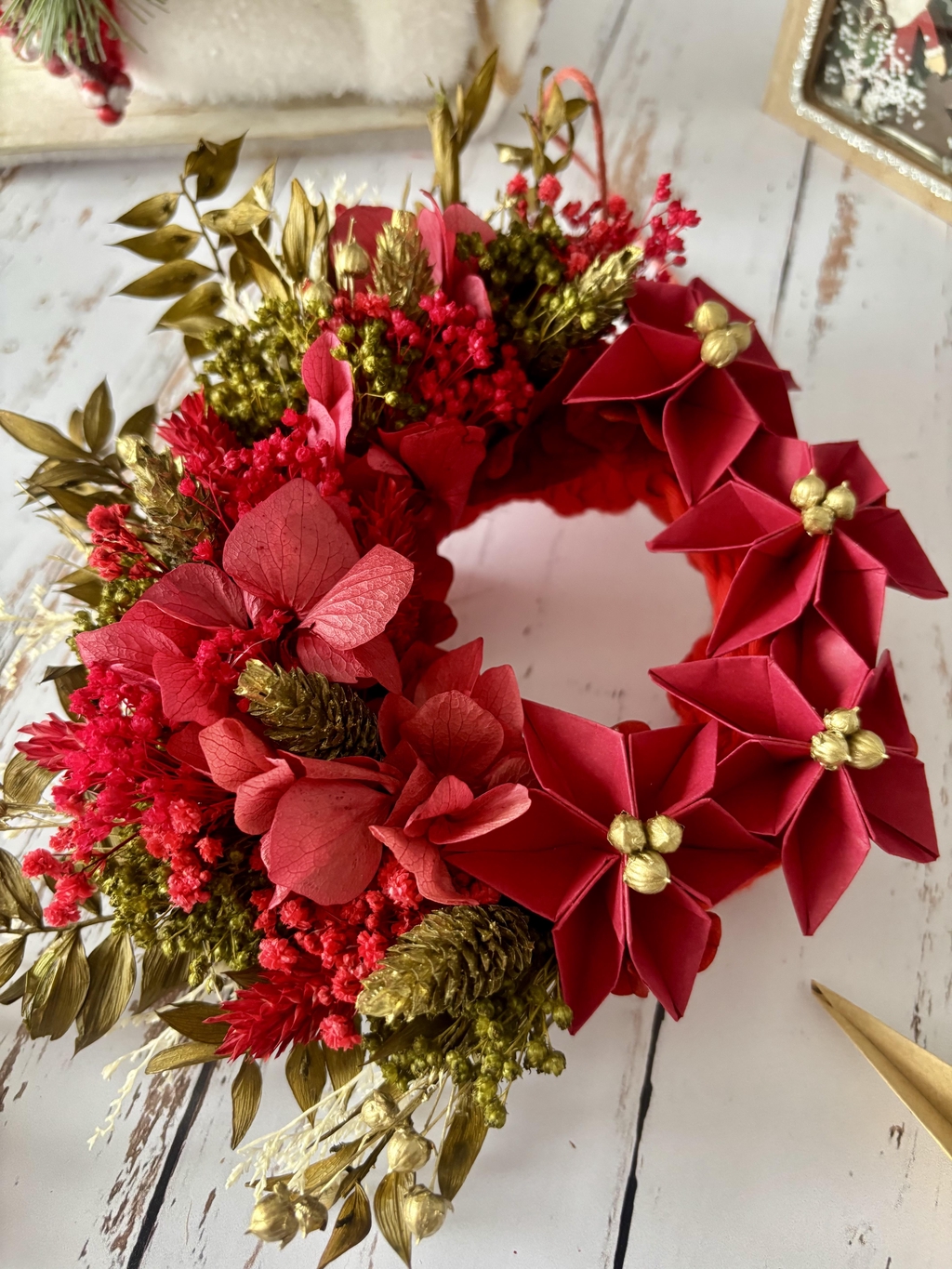 Je sélectionne mes fleurs séchées avec un œil attentif, puis je plie mes petits papiers un à un, avec le soin patient du travail fait main, pour donner naissance à des fleurs en origami qui apportent une touche singulière à chaque composition.